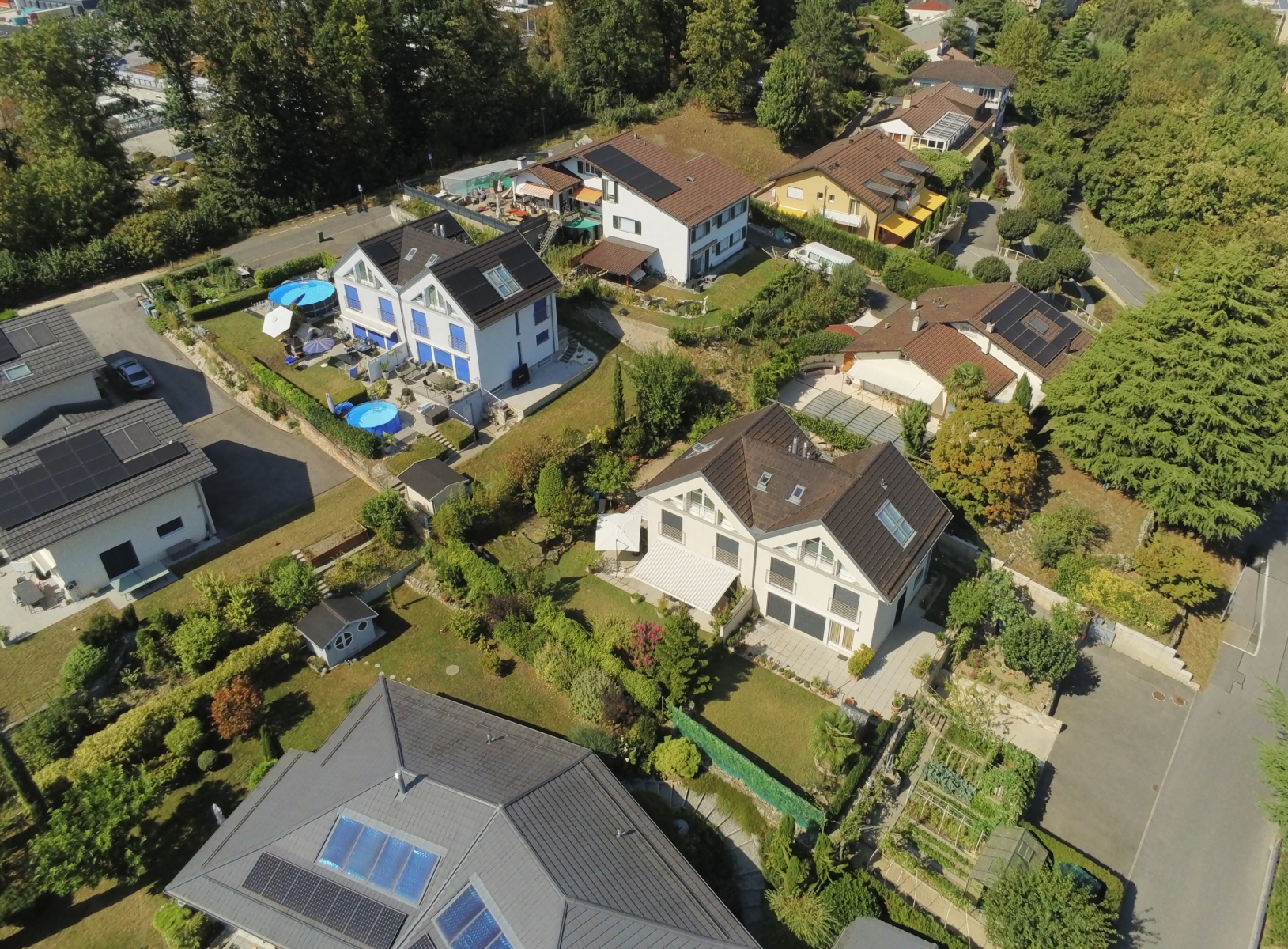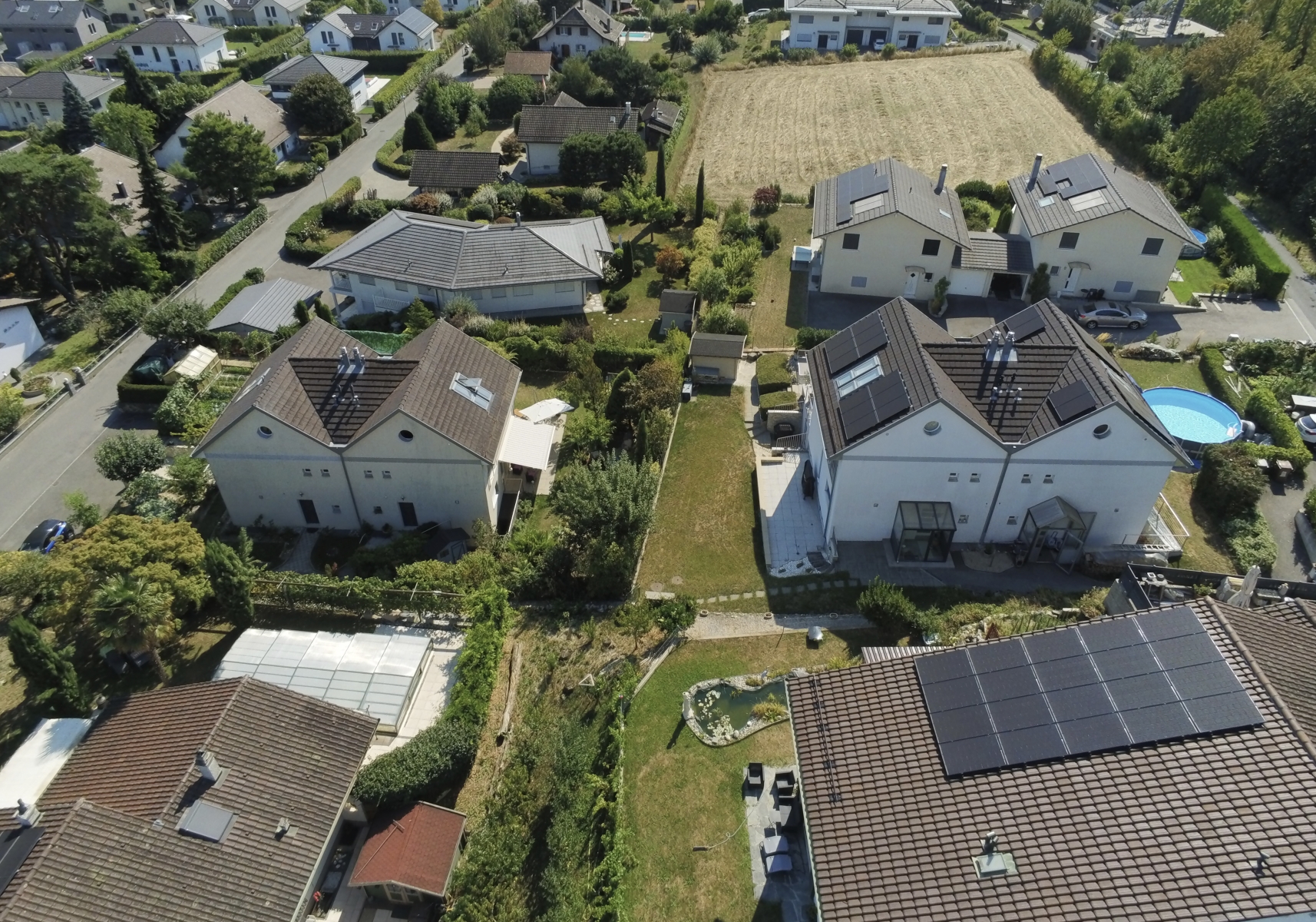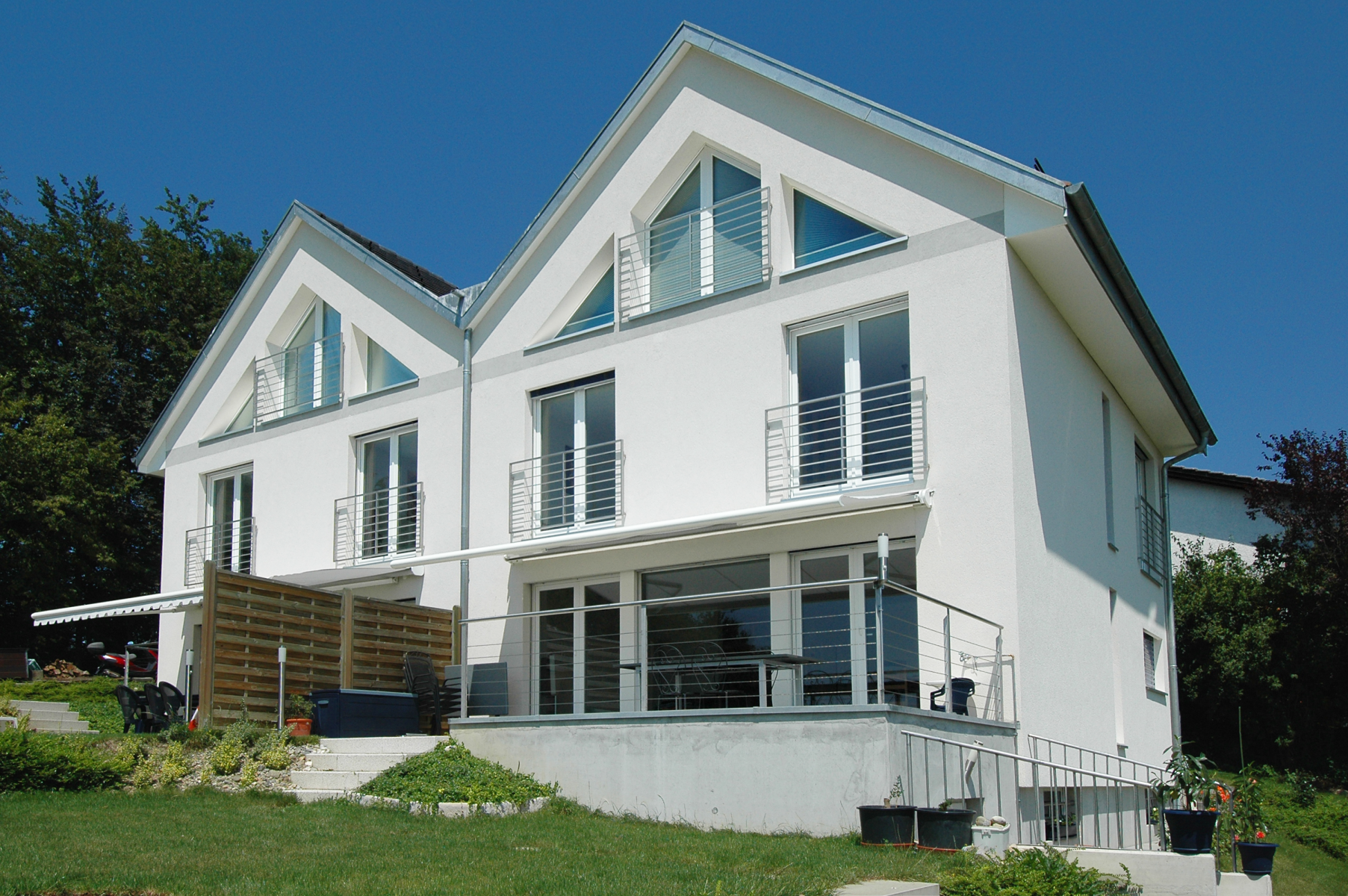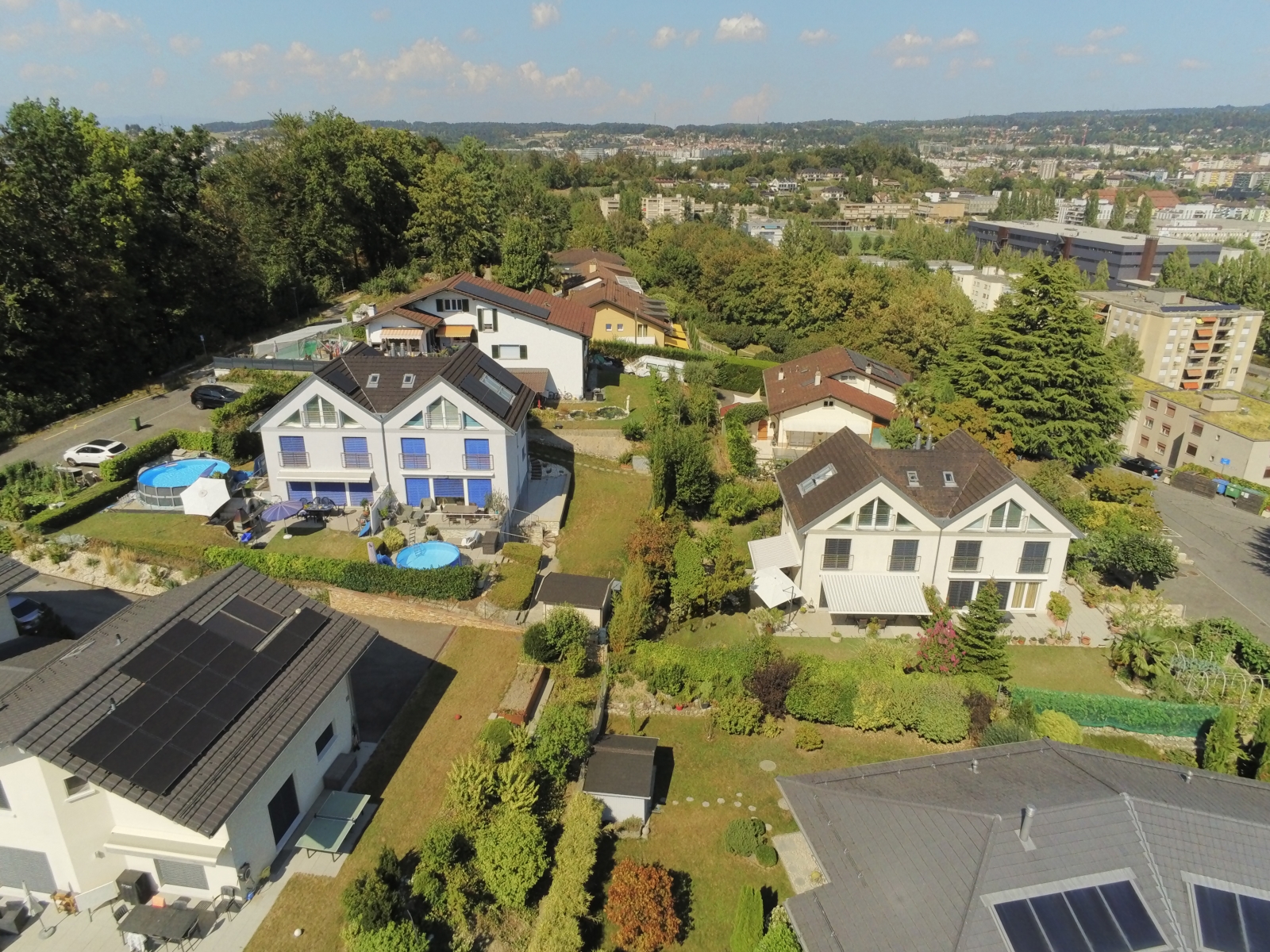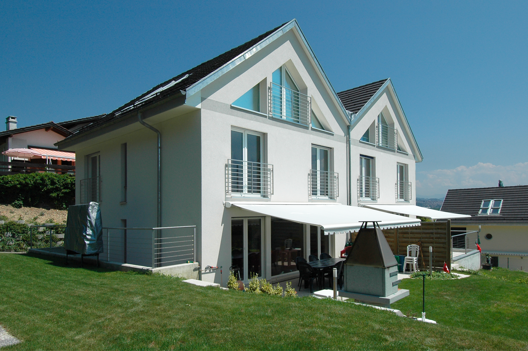 Construites sur le coteau d'Ecublens dans un terrain en pente moyenne, l'une des principales difficultés de ce projet résidait dans la conception de quatre logements répartis en deux habitations, ainsi que dans la possibilité d'offrir un maximum de surfaces extérieures pour satisfaire les demandes des propriétaires.