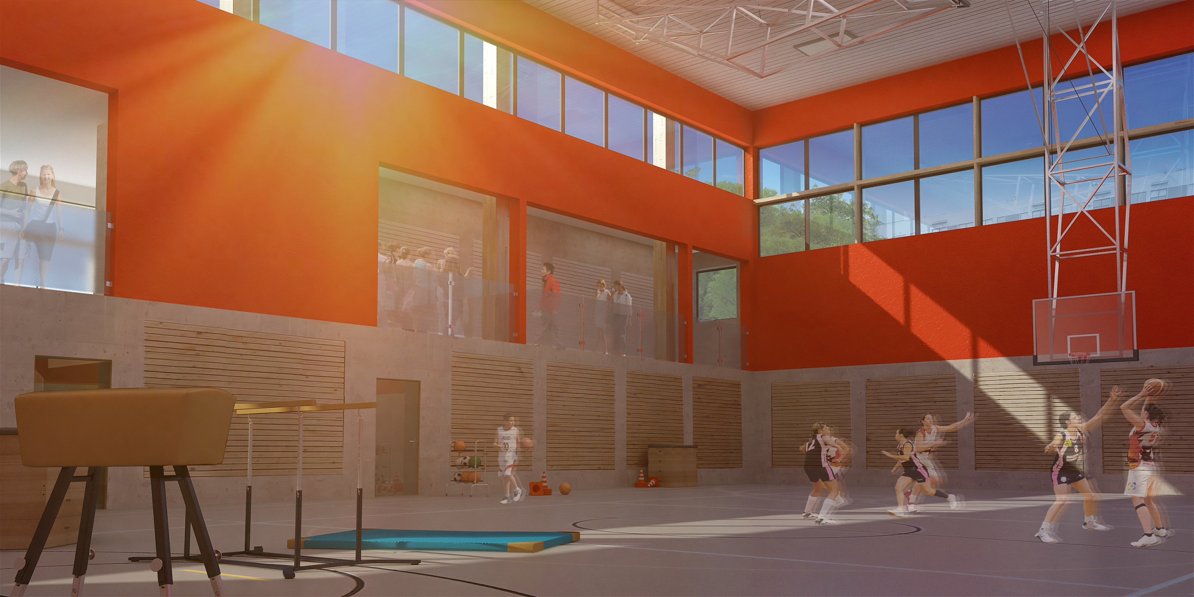 Les exigences requises au niveau de l’acoustique sont assurées par des parois en bois (Douglas) insérées dans le béton et situées dans la partie inférieure de la salle de gym. Au sujet de la lumière, la couverture des besoins en éclairage sera assurée par 50 % minimum de lumière naturelle de 300 LUX pour les surfaces concernant les espaces de vie. L’apport de lumière naturelle a été optimisé au maximum, tout en répondant aux critères Minergie ECO ainsi qu’aux recommandations pour salle de sport du Service de l’éducation physique et du sport.