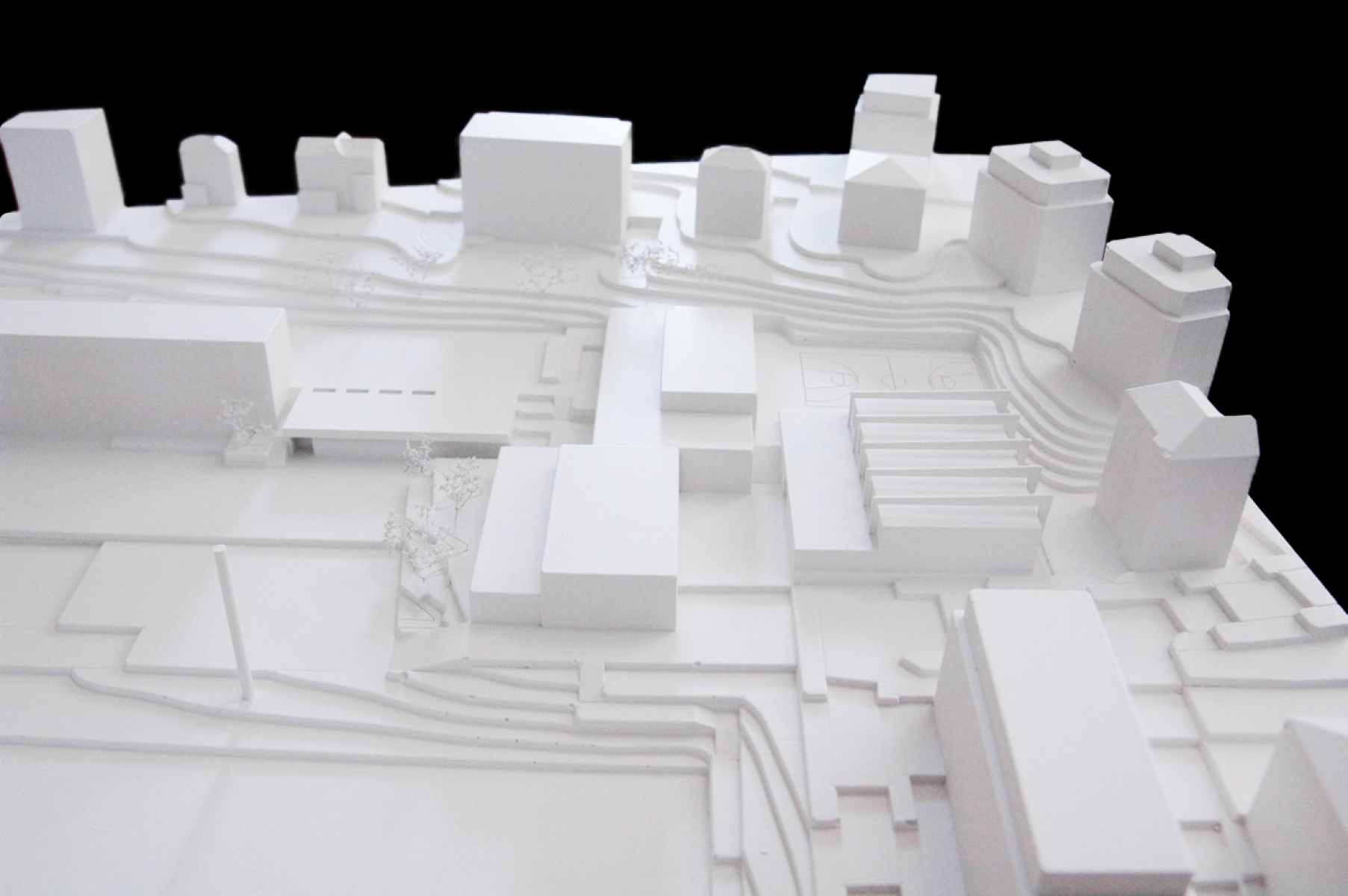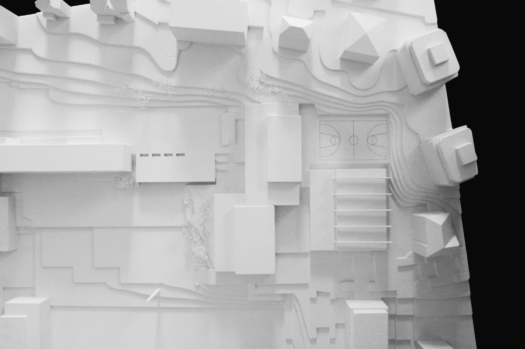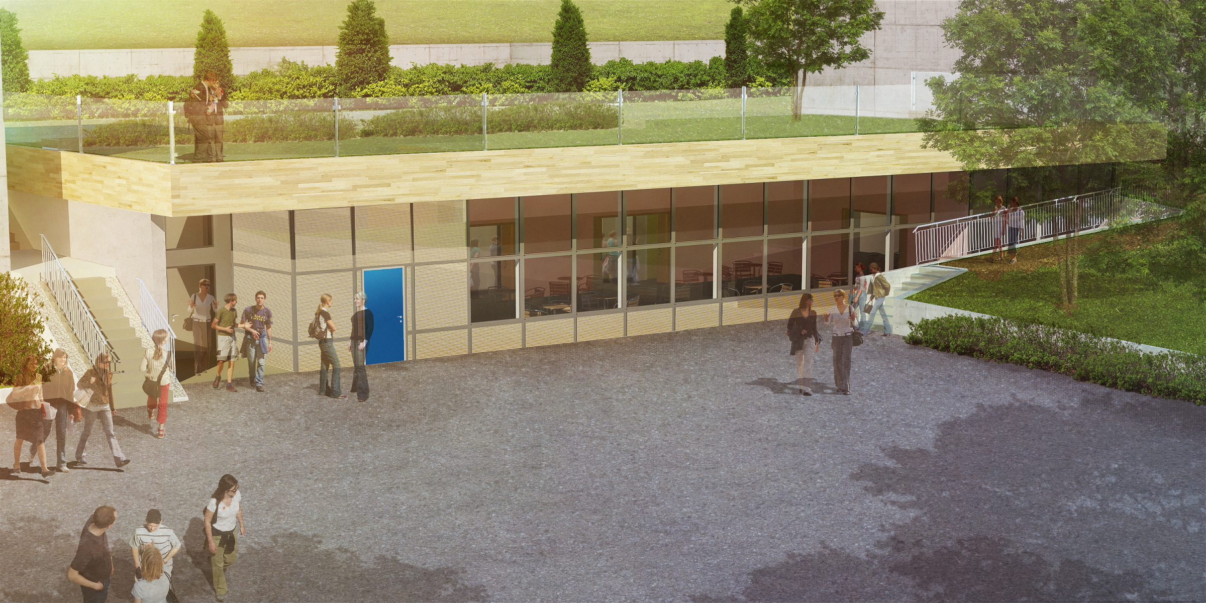 L’implantation de l’espace destiné à l’accueil de jour des élèves du quartier provenant notamment de l’établissement de Mon-Repos implanté au Sud du site de Béthusy, implique une préférence volontaire de se trouver au coeur du site. En effet, le choix stratégique du lieu démontre la justesse du geste par les possibilités qu’il engendre : la convergence de toutes parts d’abord et son intégration dans la pente ensuite. Le fait que le bâtiment disparaisse dans le terrain avec sa toiture accessible végétalisée a pour avantage d’offrir un espace extérieur lié à cette entité, et répond à la nécessité d’intégration dans un site construit, qui de plus, est représentatif de différentes périodes architecturales.