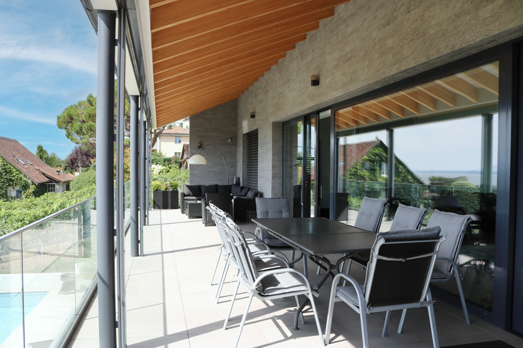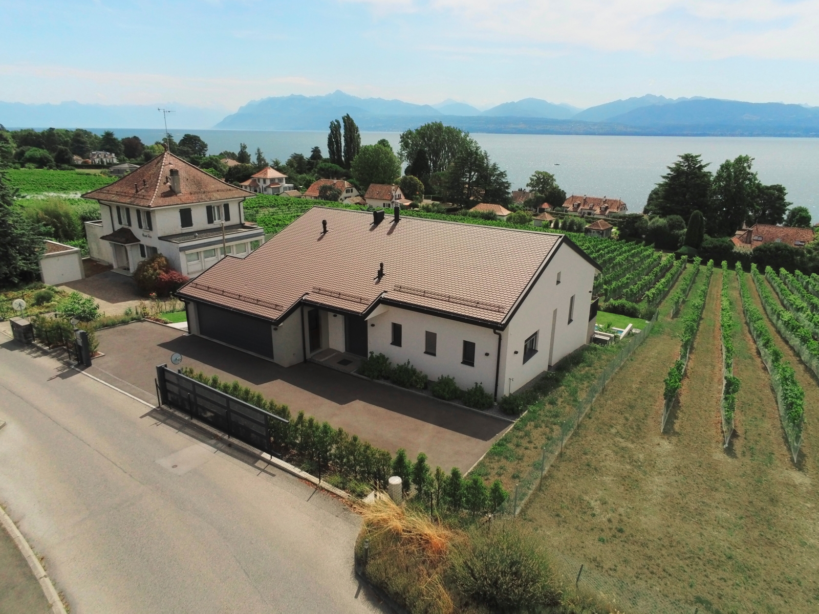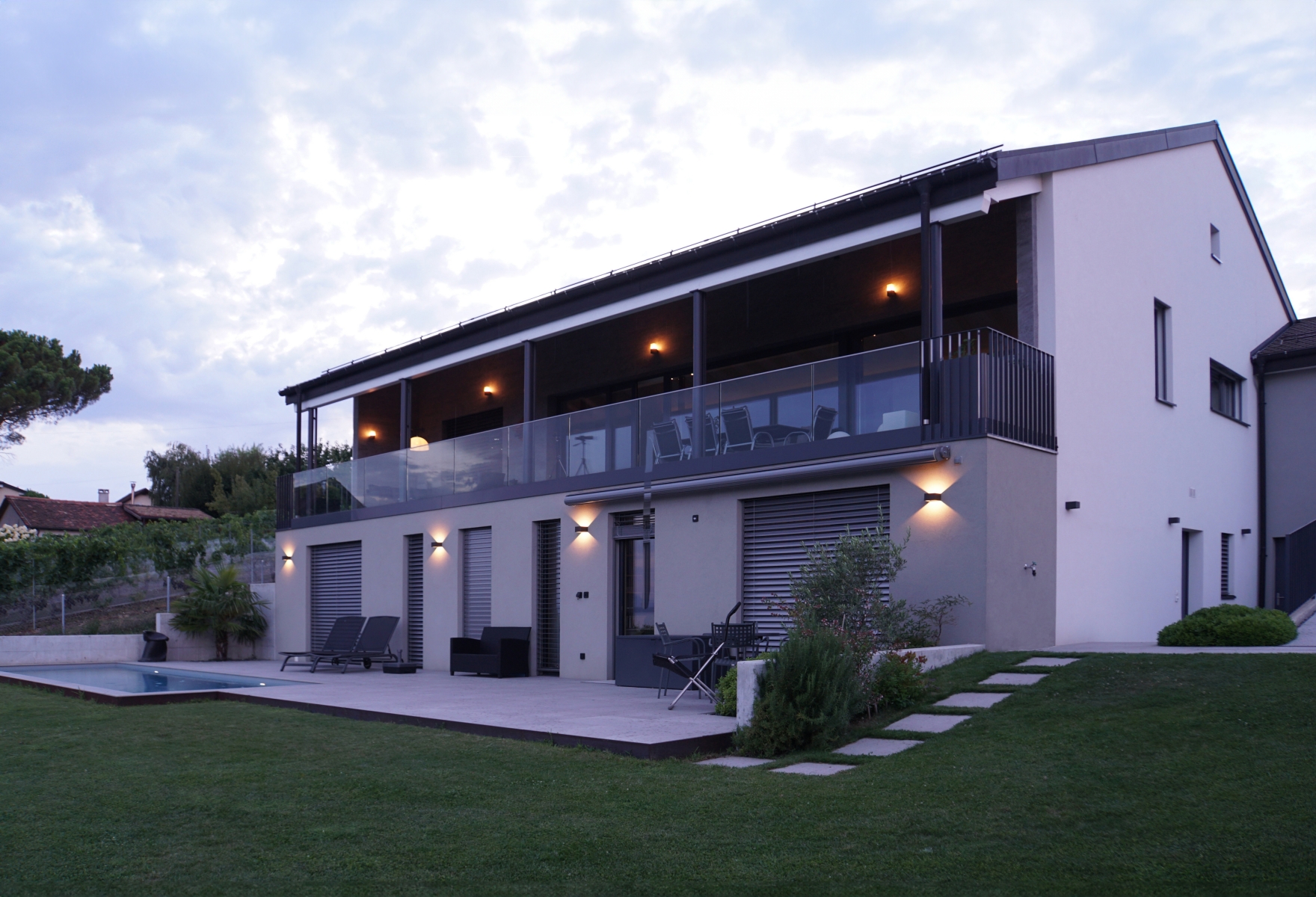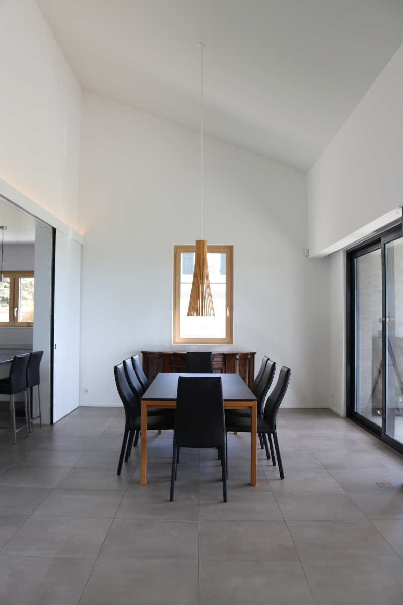 Grâce à de larges baies vitrées, la façade Sud de l'étage, dans les zones de jour, s'ouvre sur un panorama idyllique formé de vignes, du lac et des montagnes, tel un tableau, permettant à la lumière de pénétrer sur toute la profondeur de l'habitation. Cette notion d'ouverture est également accentuée par l'organisation intérieure des espaces, dont la totalité du volume dédié à la partie jour est ouverte.