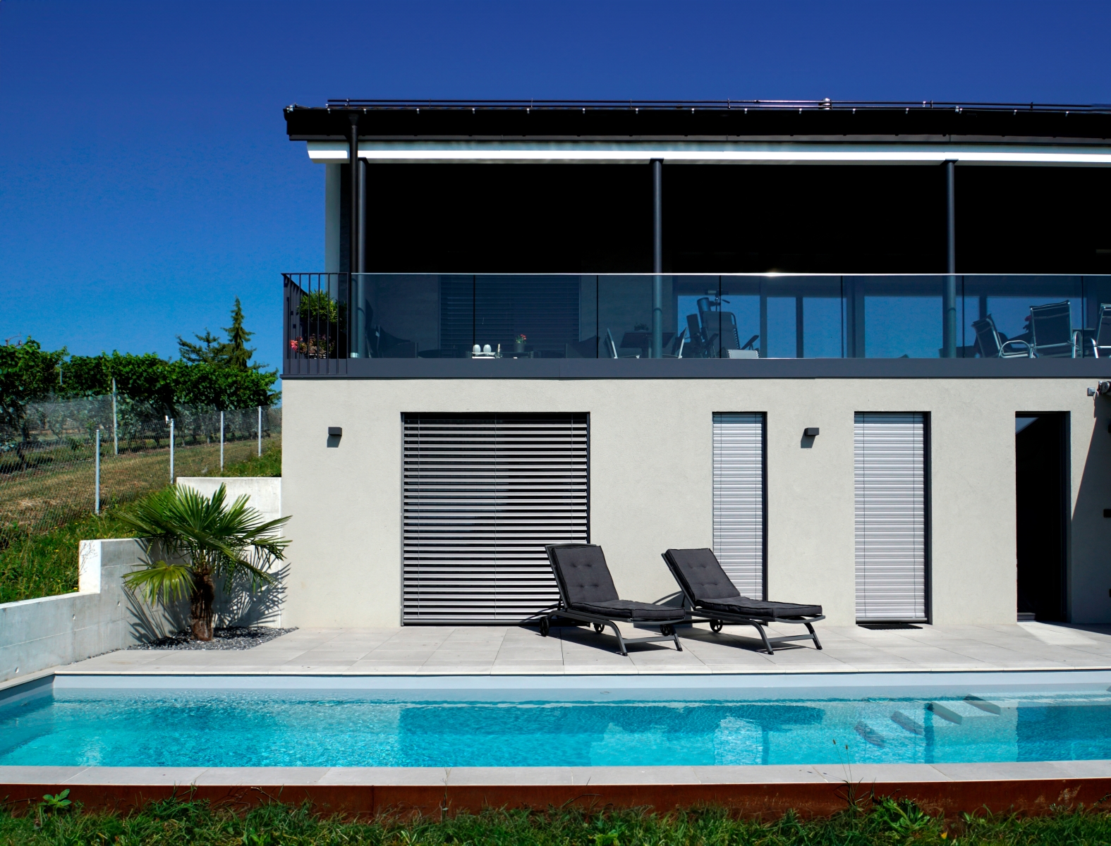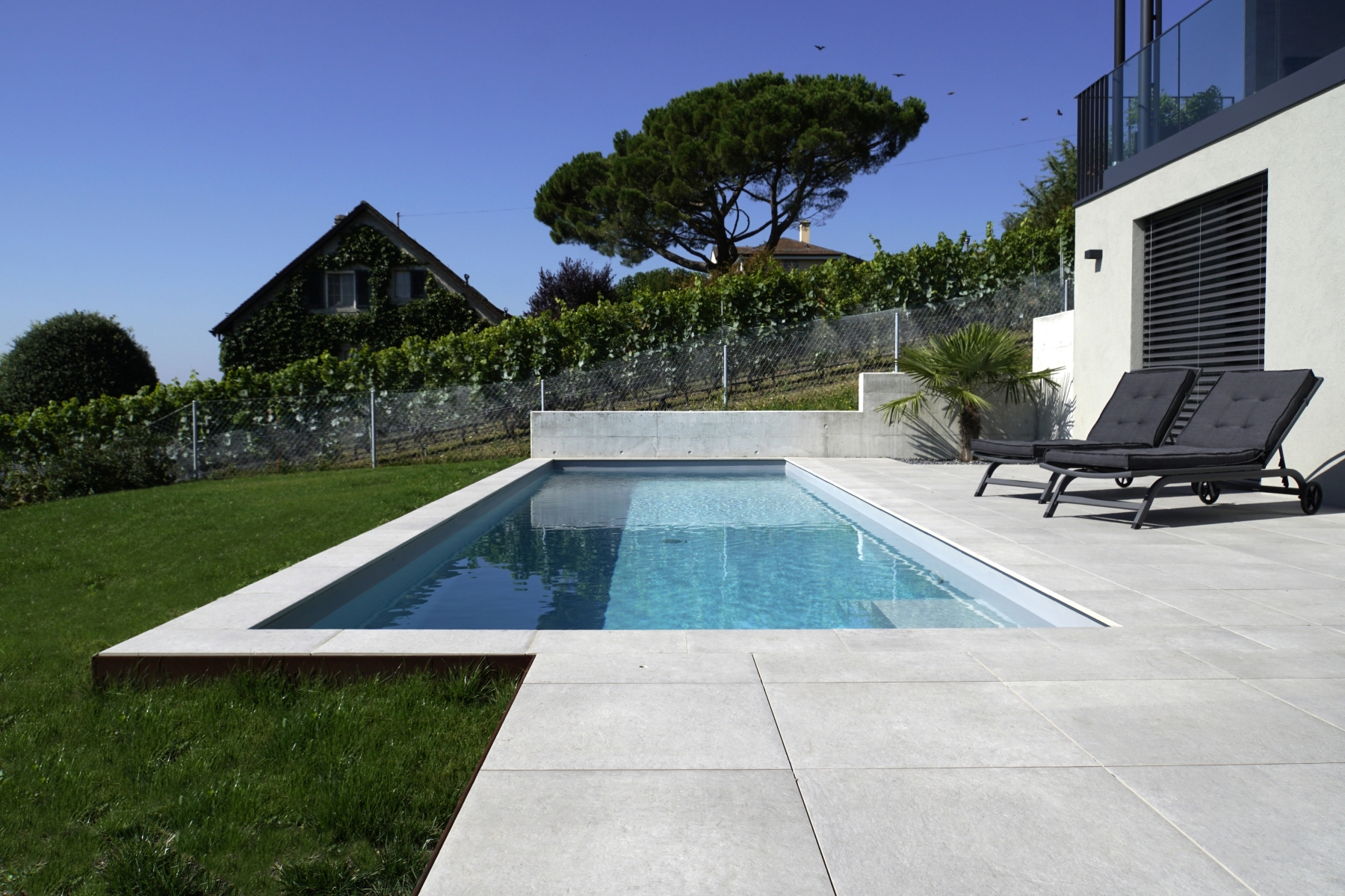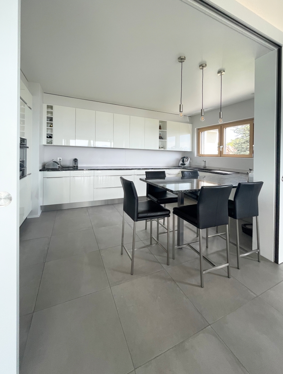 Grâce à de larges baies vitrées, la façade Sud de l'étage, dans les zones de jour, s'ouvre sur un panorama idyllique formé de vignes, du lac et des montagnes, tel un tableau, permettant à la lumière de pénétrer sur toute la profondeur de l'habitation. Cette notion d'ouverture est également accentuée par l'organisation intérieure des espaces, dont la totalité du volume dédié à la partie jour est ouverte.