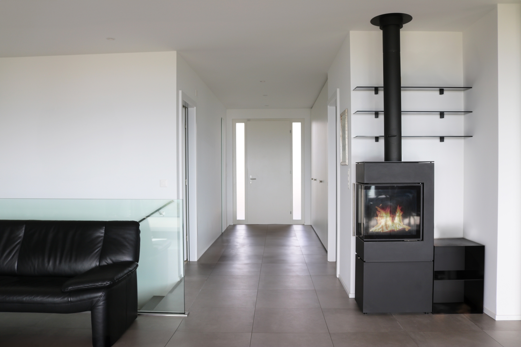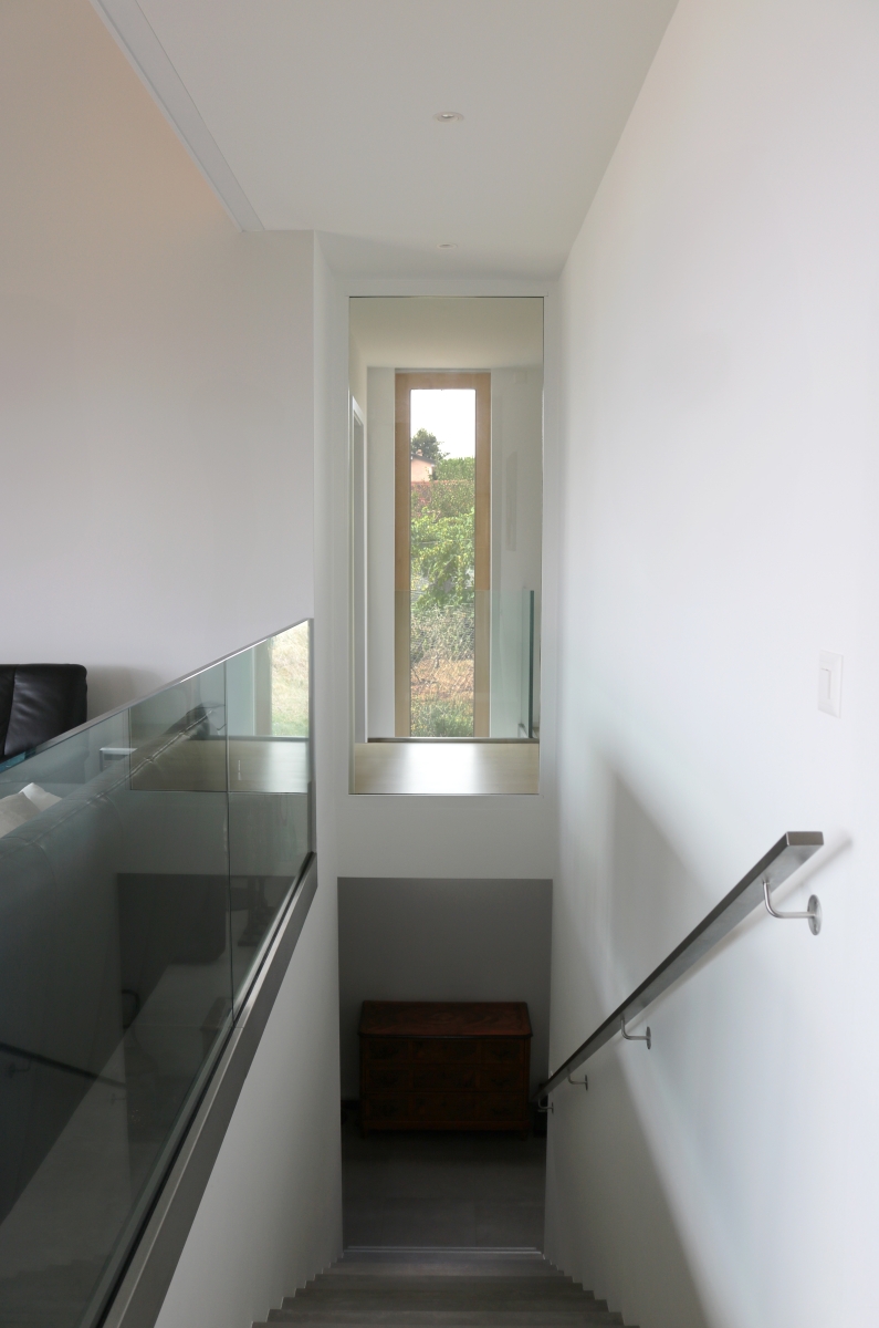 Les circulations intérieures ont été soigneusement travaillées avec notamment avec la matérialisation de l'escalier droit qui devient un objet à part entière pour lui-même, tel une sculpture qui habille l'espace en toute transparence.