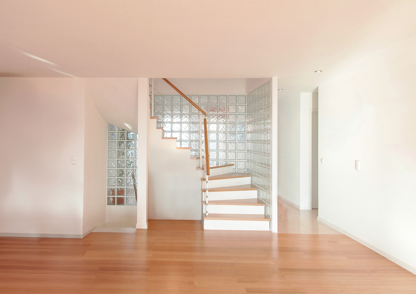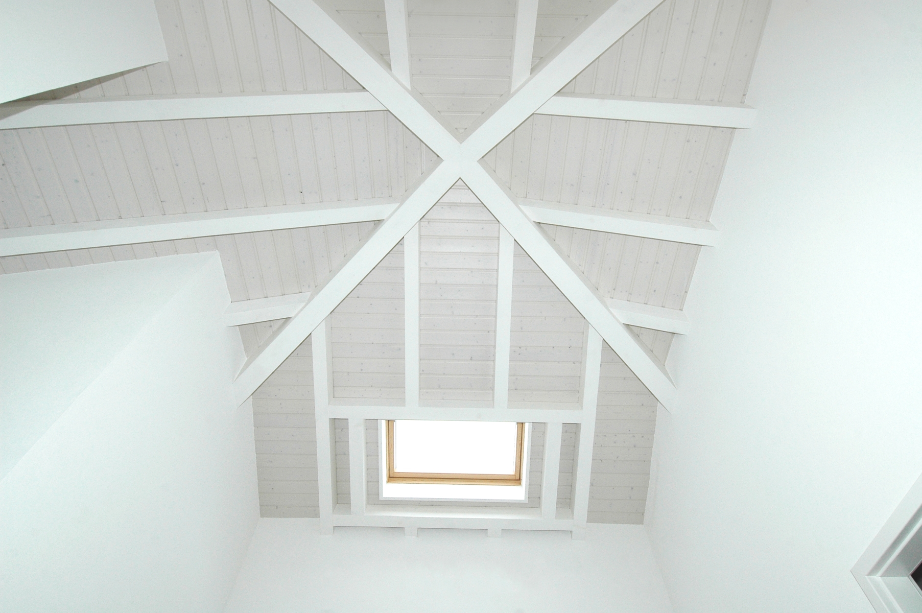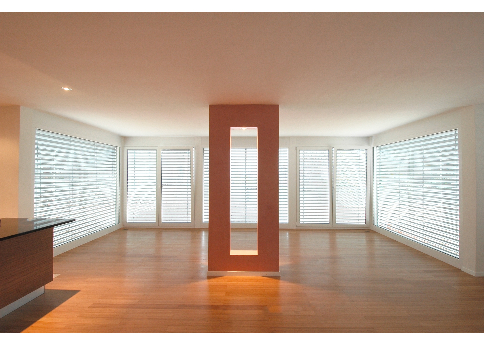 Une autre particularité de cette maison, dont la géométrie exprime un cube, réside dans l'implantation de quatre piliers positionnés à 45° aux quatre angles du bâtiment, donnant l’expression de soutien de la marquise supérieure en béton et où ont été insérées les descentes d’eaux pluviales du chéneau encaissé.