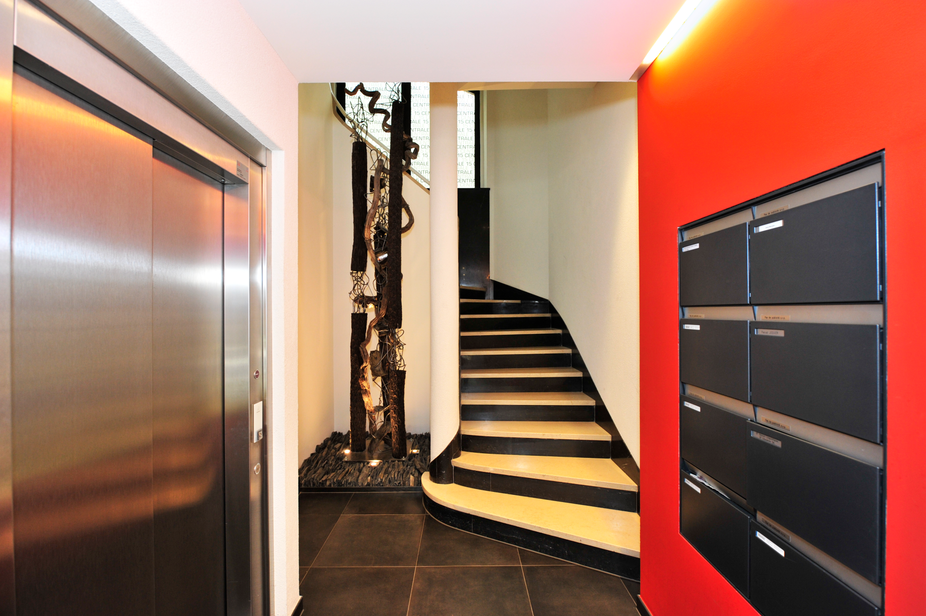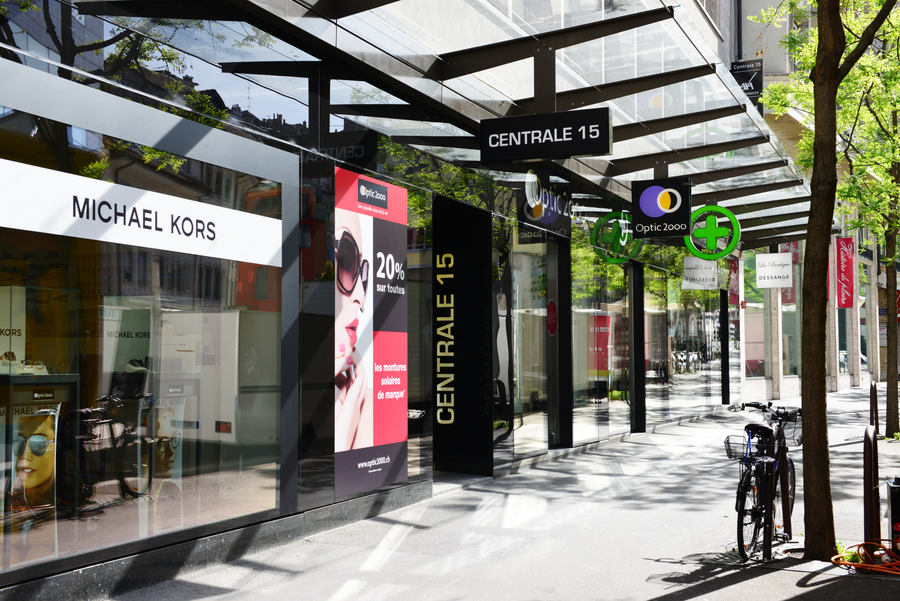 Le socle, quant à lui, a été entièrement revisité par le traitement des surfaces commerciales en totale transparence. L’idée était de supprimer les vitrines traditionnelles créant un premier plan au profit du magasin lui-même, le mettant ainsi en valeur. Il en va de même pour la marquise entièrement vitrée située au-dessus des commerces, protégeant ainsi une partie du trottoir et les piétons tout en laissant passer le maximum de lumière pour les magasins. Sous le regard du Service de Protection du patrimoine bâti, la façade sur la rue Centrale ainsi que sa cage d’escalier « protégées » démontrent dans leur ensemble qu’il est possible d’allier non seulement le respect dû à un bâtiment ancien, avec ses contraintes imposées, mais aussi d'y joindre une technologie d'exploitation de pointe, le tout étant parfaitement compatible.